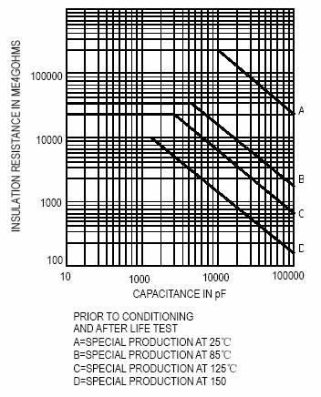 Since insulation resistance is a function of both capacitance and temperature, it of necessity is lower with higher capacitance values and higher operating temperatures. However, dipped mica capacitors having higher insulation resistance values than specified in the commercial and military specifications, are available. Following are curves of insulation resistance requirements which are normally employed for special production dipped mica capacitors.