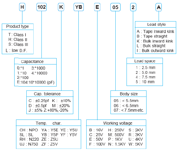 Life Test | Cap. change within ±5% (YA), ±10% (YB), ±20% (ZE), ±30% (ZF) D.F.: 5% Max for YA, YB, ZE, 7.5% Max for ZF I.R. : >1000MΩ |